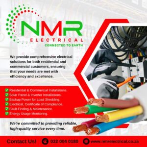 NMR Electrical Pty Ltd is a reputable electrical services company based in KwaDukuza, KwaZulu-Natal (address: 7 Melinda Lane, Mount Richmore, Umhlali). Since its founding in March 2015, the team has accumulated over 100 years of combined electrical experience. They offer a full range of services including installations, repairs, generator and solar systems, compliance certificates, and maintenance.